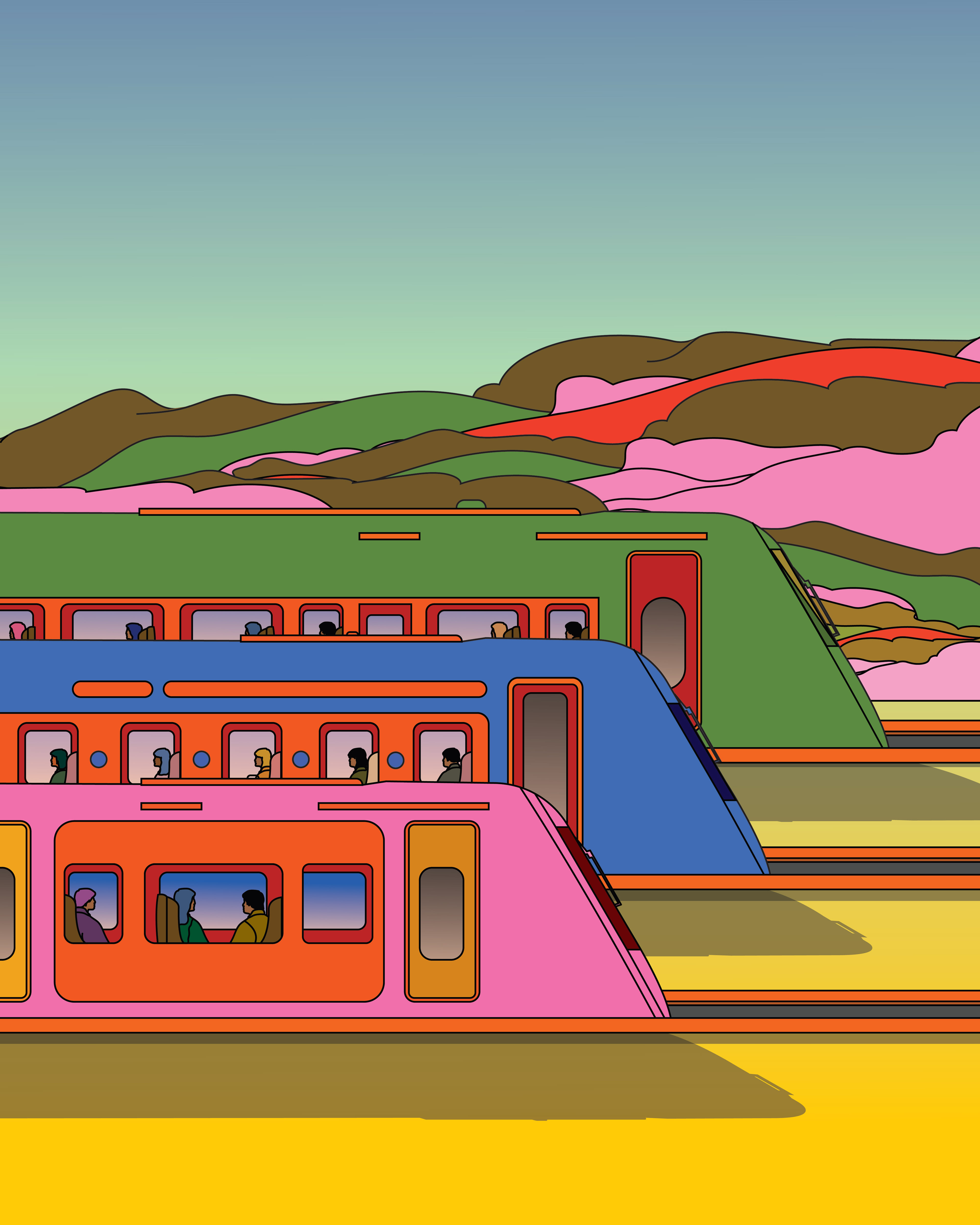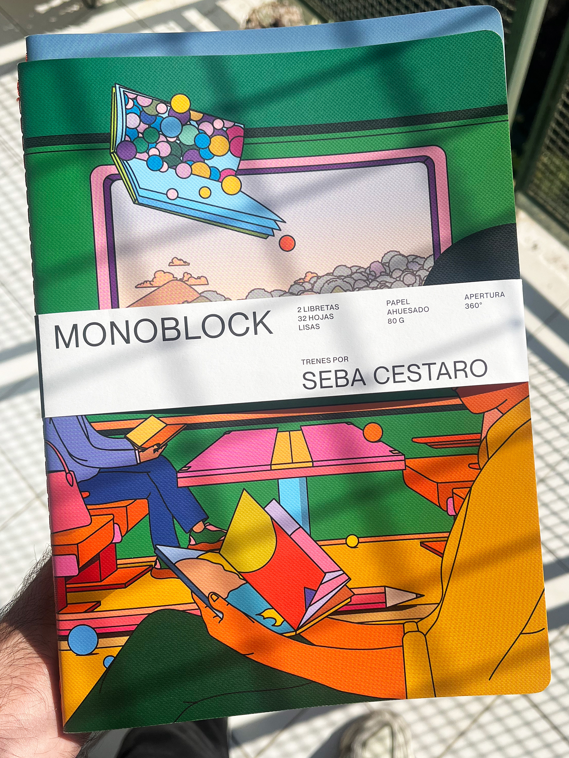 Monoblock, the largest stationery brand in Argentina, invited me to collaborate on a special edition of sketchbooks featuring my illustrations. For this project, I created two pieces titled “Trains,” which were used as the covers of the sketchbooks. The idea was to explore the world of train travel through a surreal and colorful lens. We also released some prints that are available at all Monoblock stores.